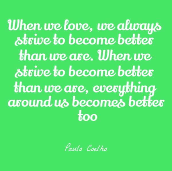When we love, we always strive to become better than we are. When we strive to become better than we are, everything around us becomes better too, Paulo Coelho. Love is the greatest.